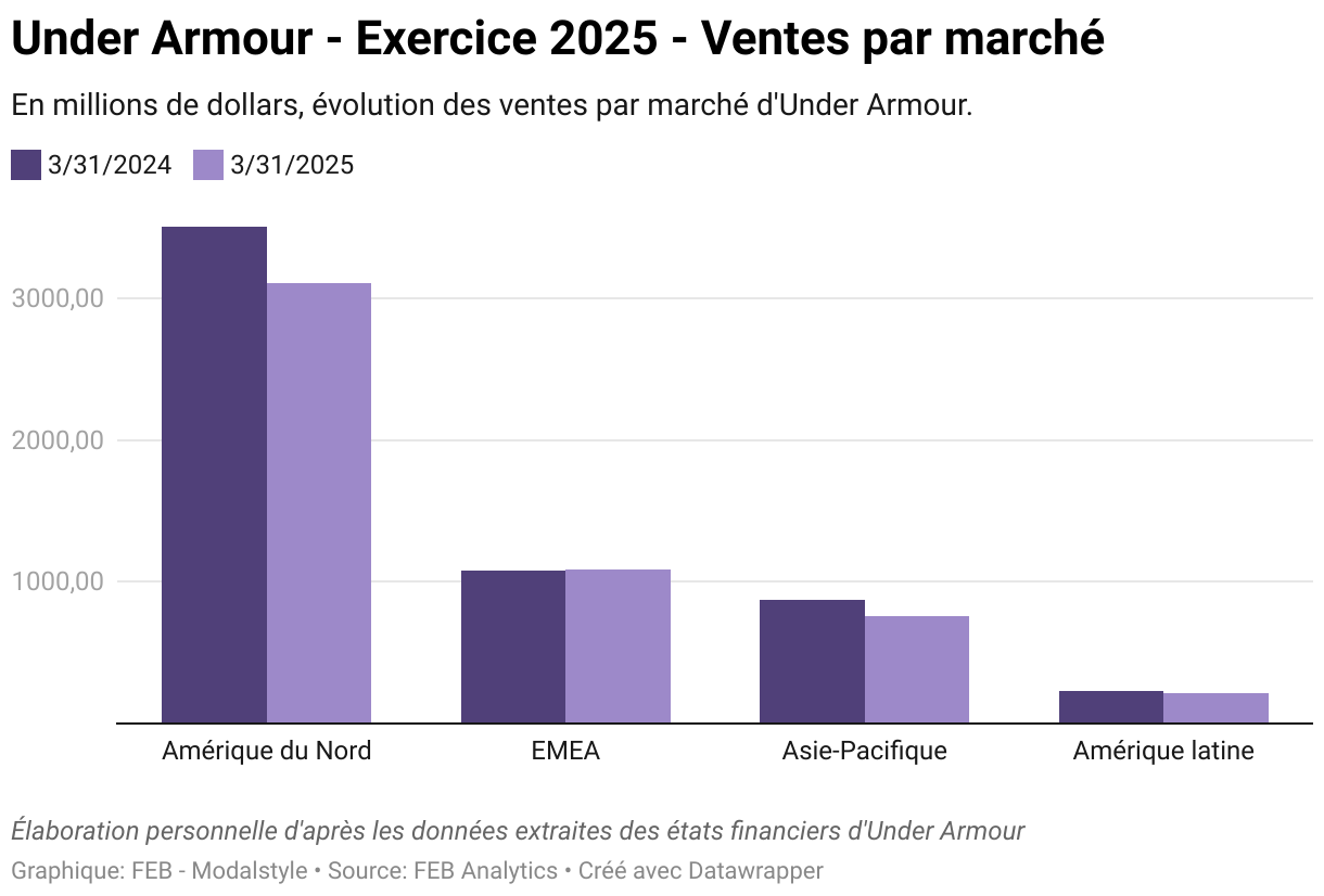 La contraction des ventes observée en 2025 ne résulte pas d'un effondrement brutal, mais d'un recentrage progressif. En Amérique du Nord, marché historique d'Under Armour, les revenus ont chuté de 11,4 % sur l'année (3,11 milliards de dollars), tandis que l'international a limité la casse à -6 %, porté par une bonne tenue en EMEA (stable à 1,08 milliard de dollars) malgré une forte baisse en Asie-Pacifique (-13,5 %) et en Amérique latine (-6,1 %).