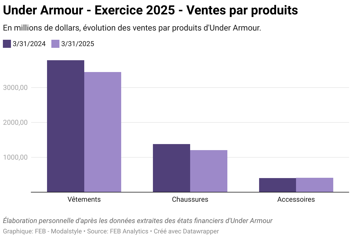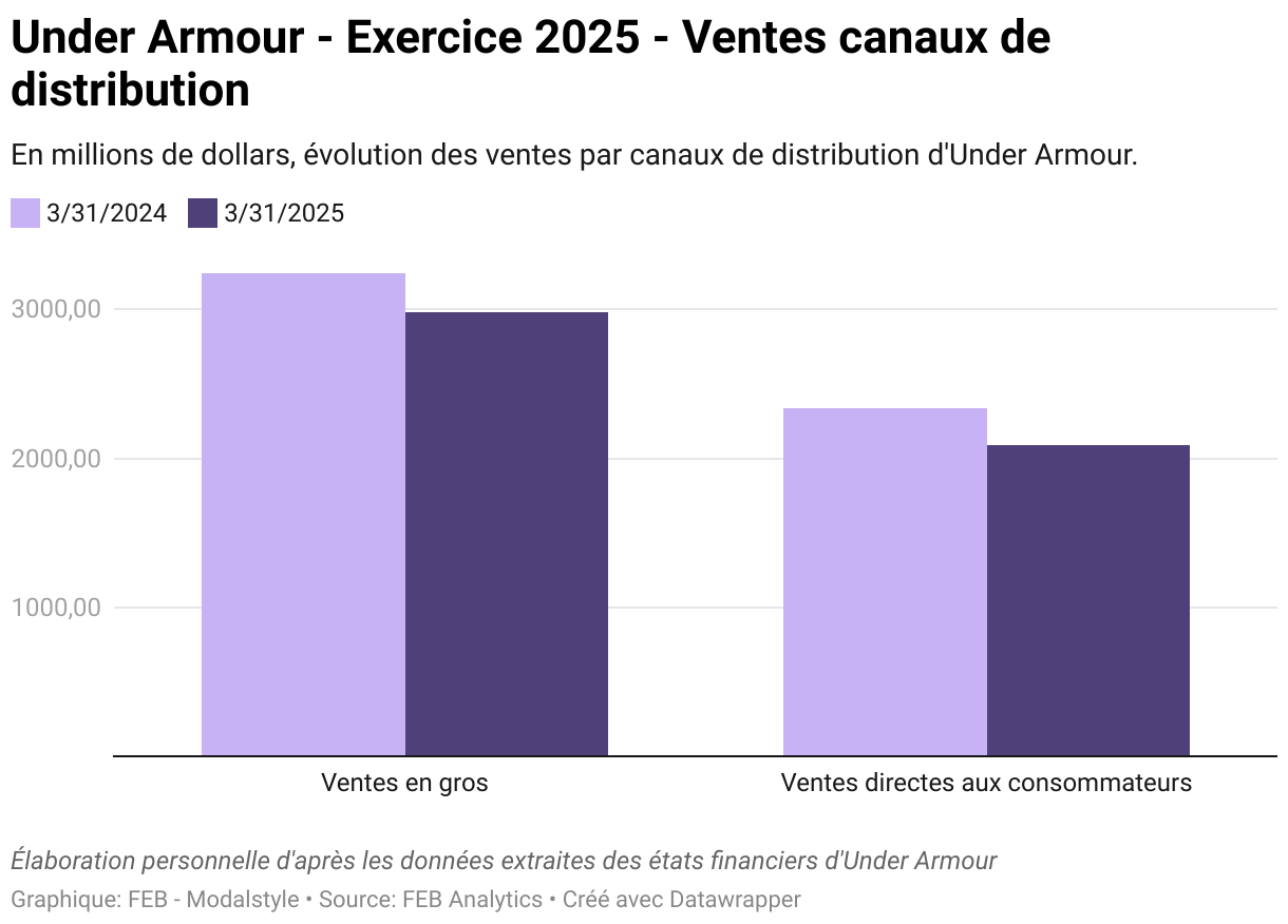Côté distribution, le canal de vente en gros, historiquement prédominant, s'est contracté de 8,1 %, à 2,98 milliards de dollars. Le direct-to-consumer, pilier du repositionnement stratégique amorcé en 2024, a lui aussi décliné de 10,5 %, notamment sous l'effet d'un recul massif de l'e-commerce (-23 %), en partie liée à la réduction volontaire des promotions et à un recentrage de la stratégie digitale.